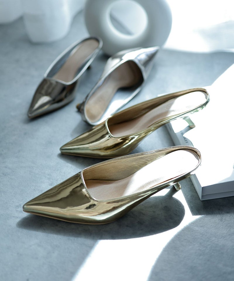 つるっとした光沢のあるメタリック色はぎらつかず洗練された大人の足元へと導きます。