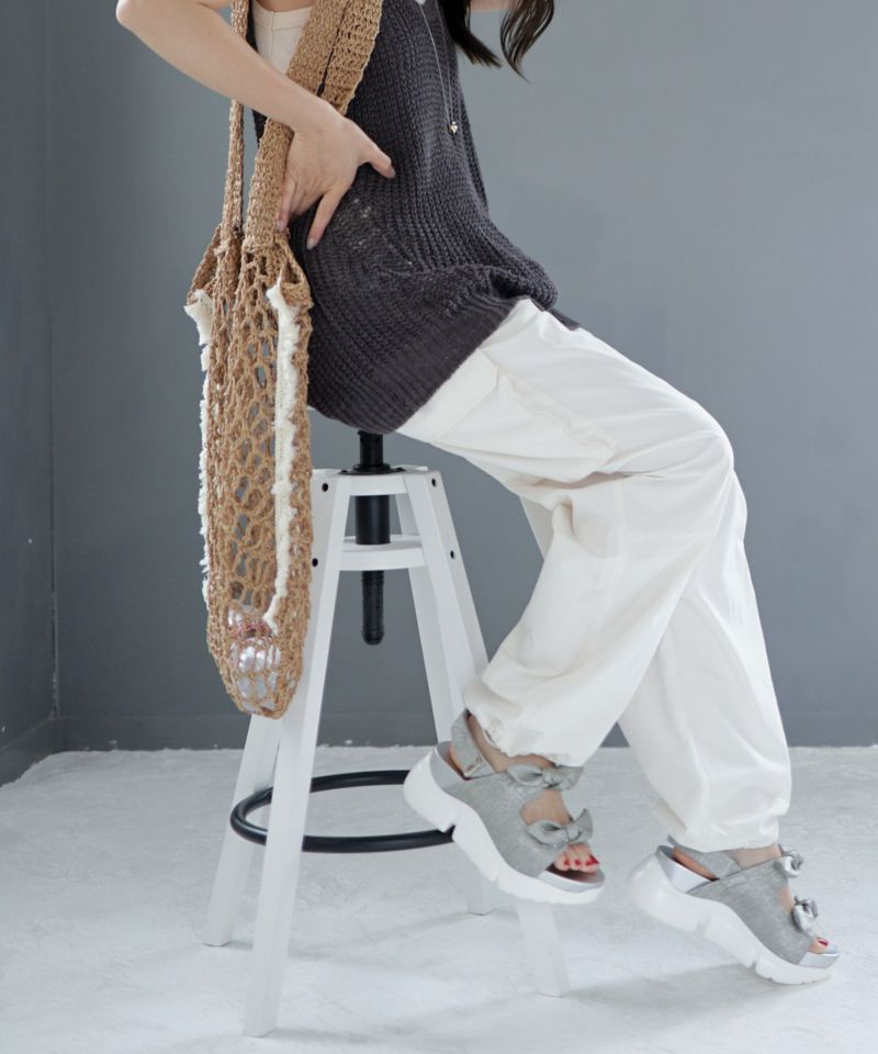 スポーティな厚底×ダブルリボンのエレガントバランスが今どきな足元へ。