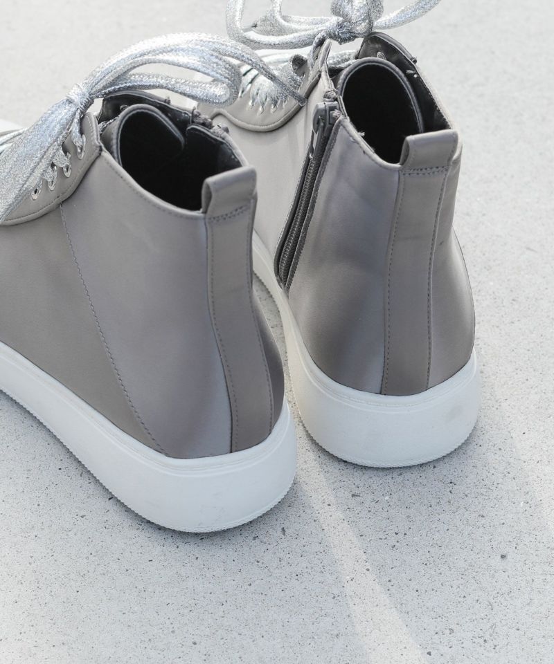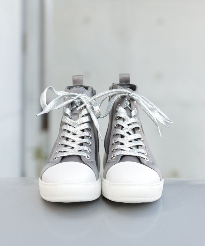 シルバーは落ち着いたグレーのようなサテン素材に、きらっと輝く靴紐が今っぽいカラー。