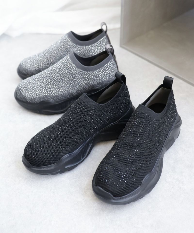 ブラックはニットと同色のクリスタルビジューを忍ばせているので、さり気なく足元を華やかにしてくれます。