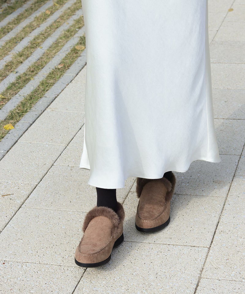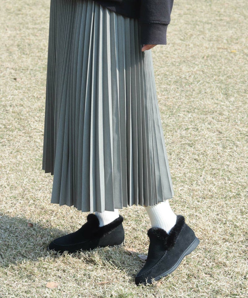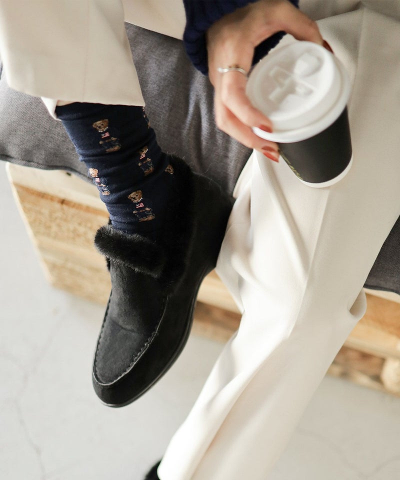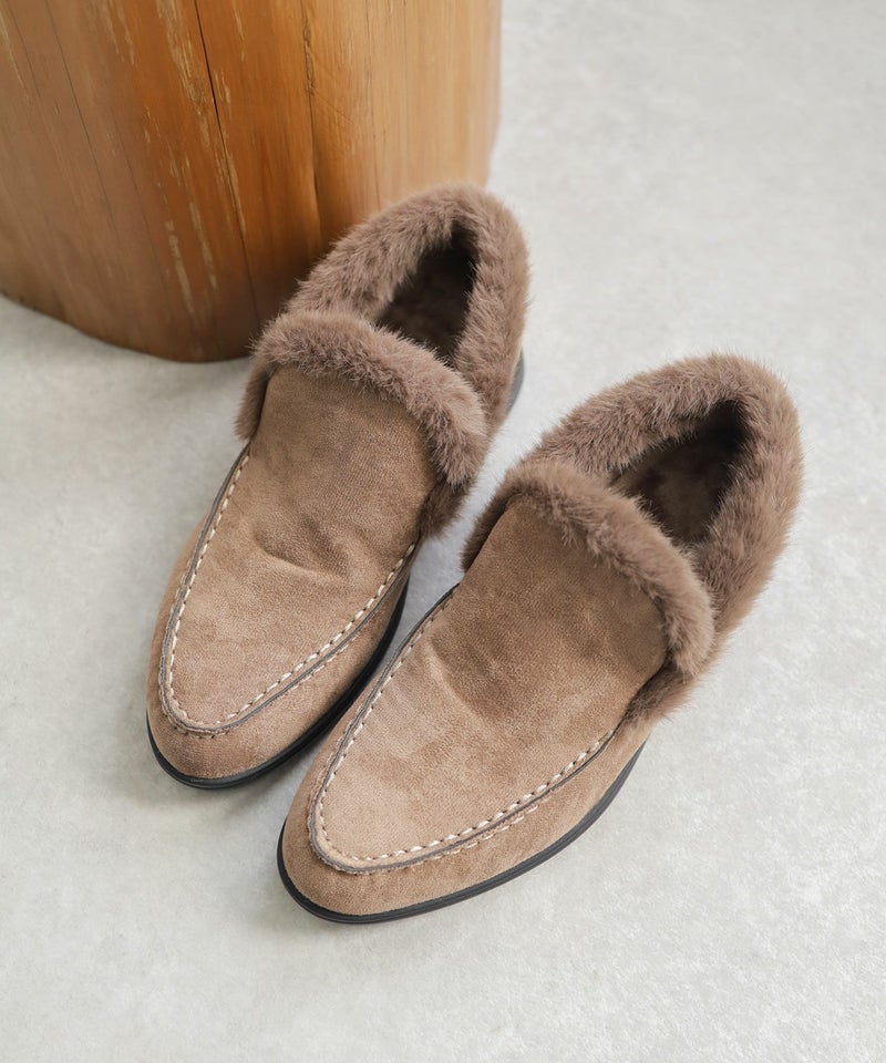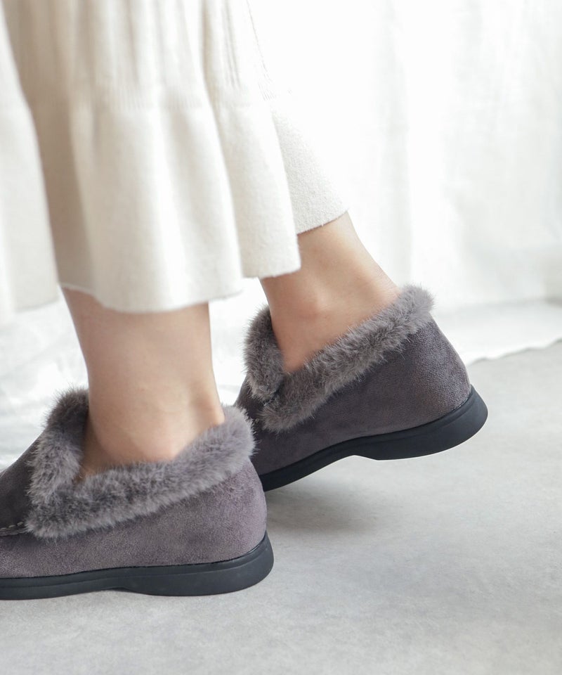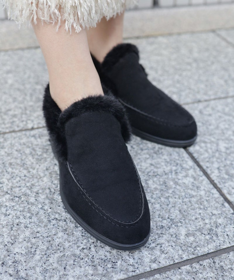 履き口のファーとステッチがアクセントになった大人っぽい印象の一足です。
