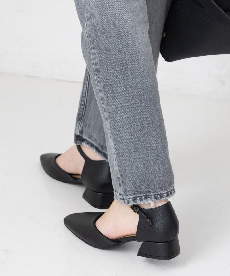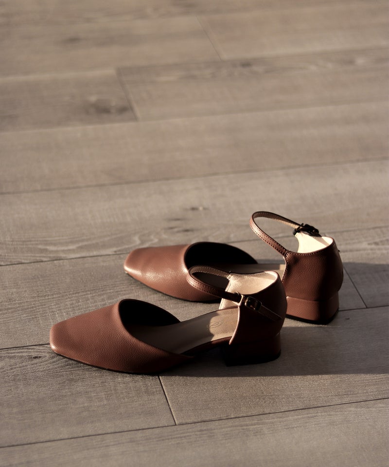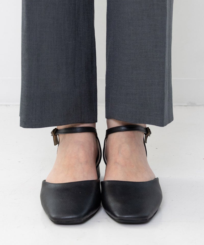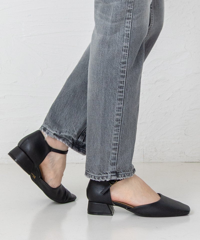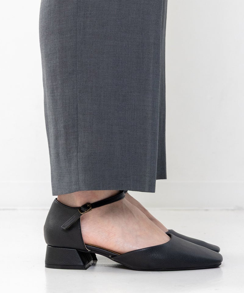 3. スクエアトゥアンクルストラップローヒールパンプス