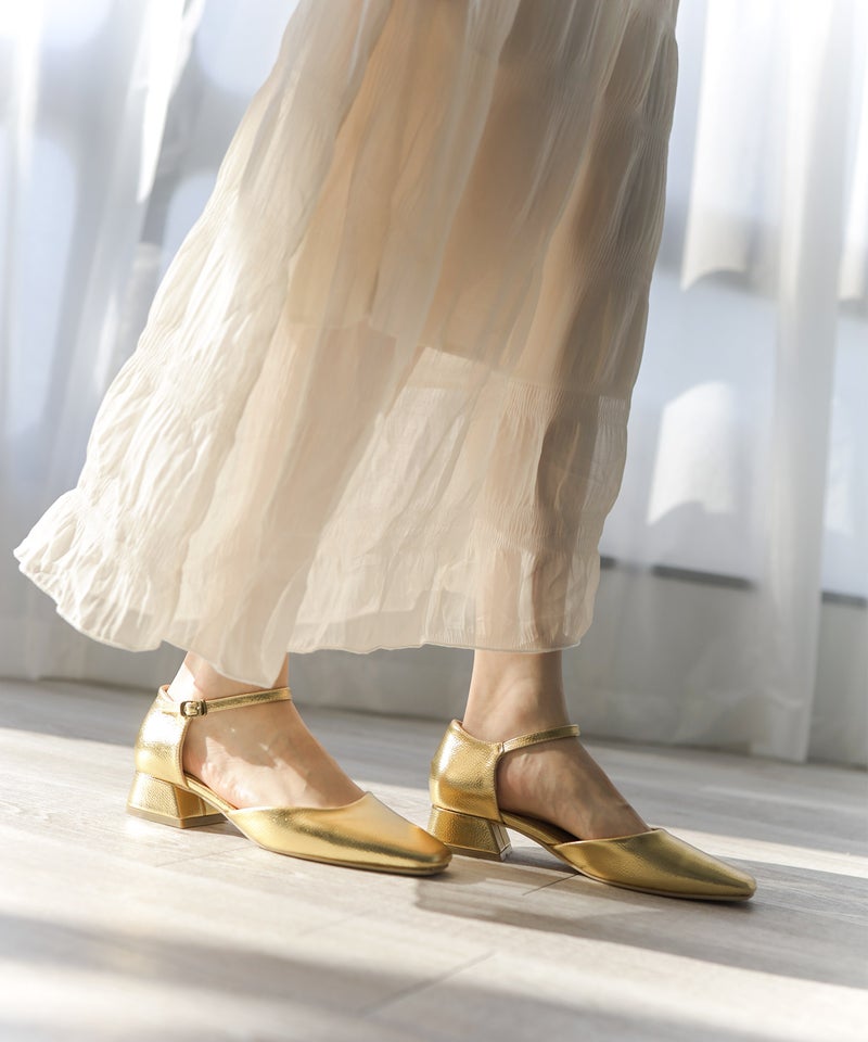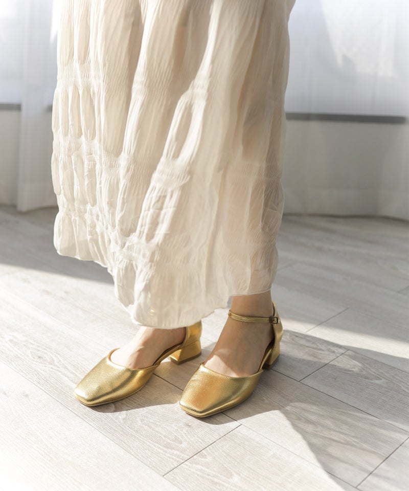 華奢なストラップとスクエアトゥが、大人の余裕を感じさせる上品な一足。