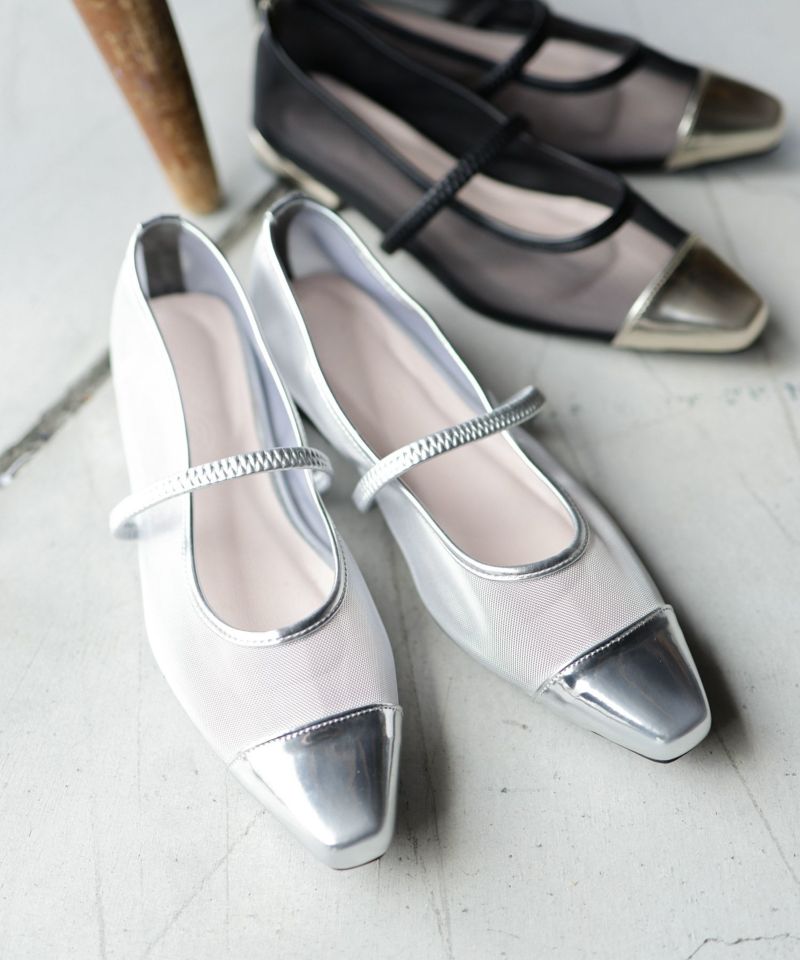 きらめくメタリックなトゥと透け感メッシュ合わせが新鮮!足元から粋なお洒落が楽しめる、履くだけでシックかつ大人モードなスタイルへとランクアップしてくれる一足。