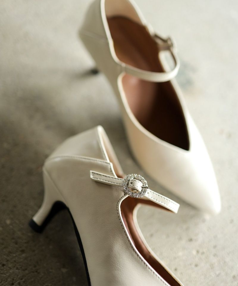 ストラップに施したビジュ-バックルが華やかさをプラスするメリージェーンパンプス。