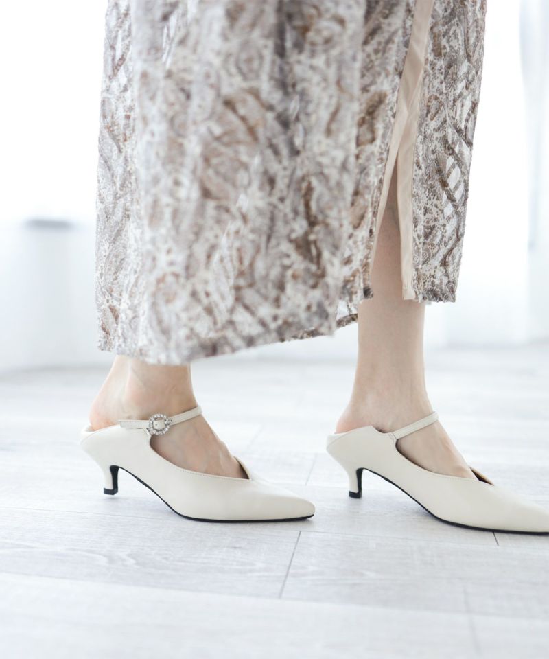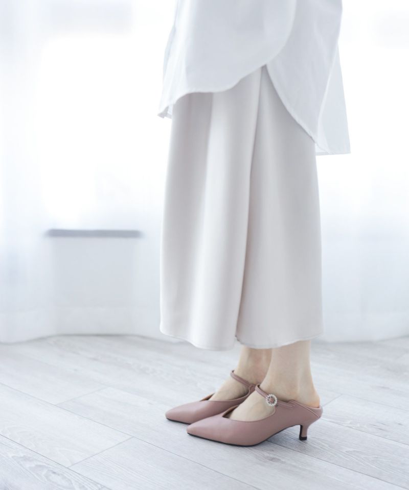 4. かかとが踏める2Way!ビジューバックルポインテッドトゥキトゥンヒールパンプス