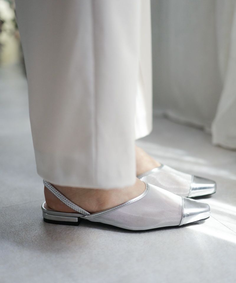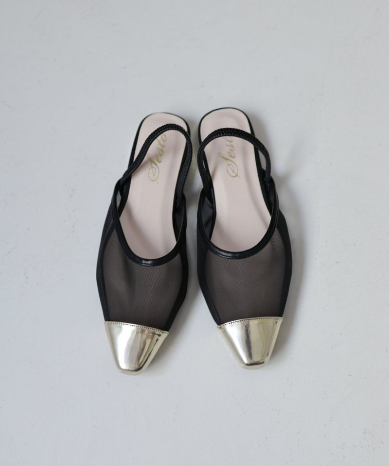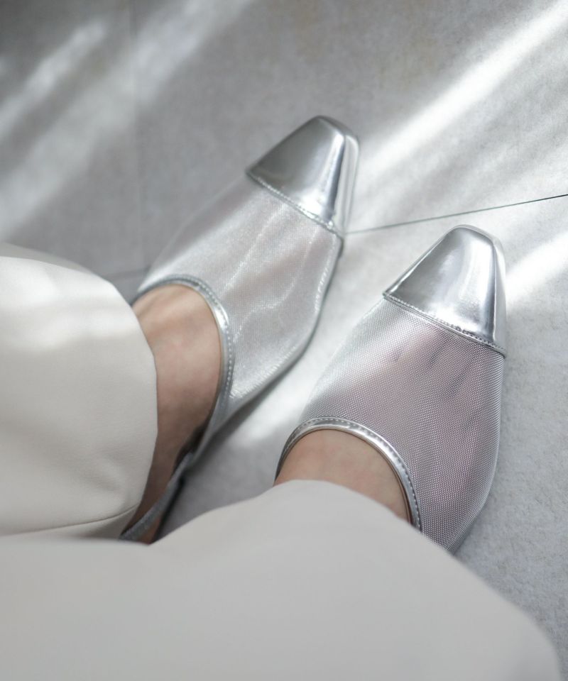 きらめくメタリックなトゥと透け感メッシュ合わせが新鮮!足元から粋なお洒落が楽しめる。履くだけでシックかつ大人モードなスタイルへとランクアップしてくれる一足。