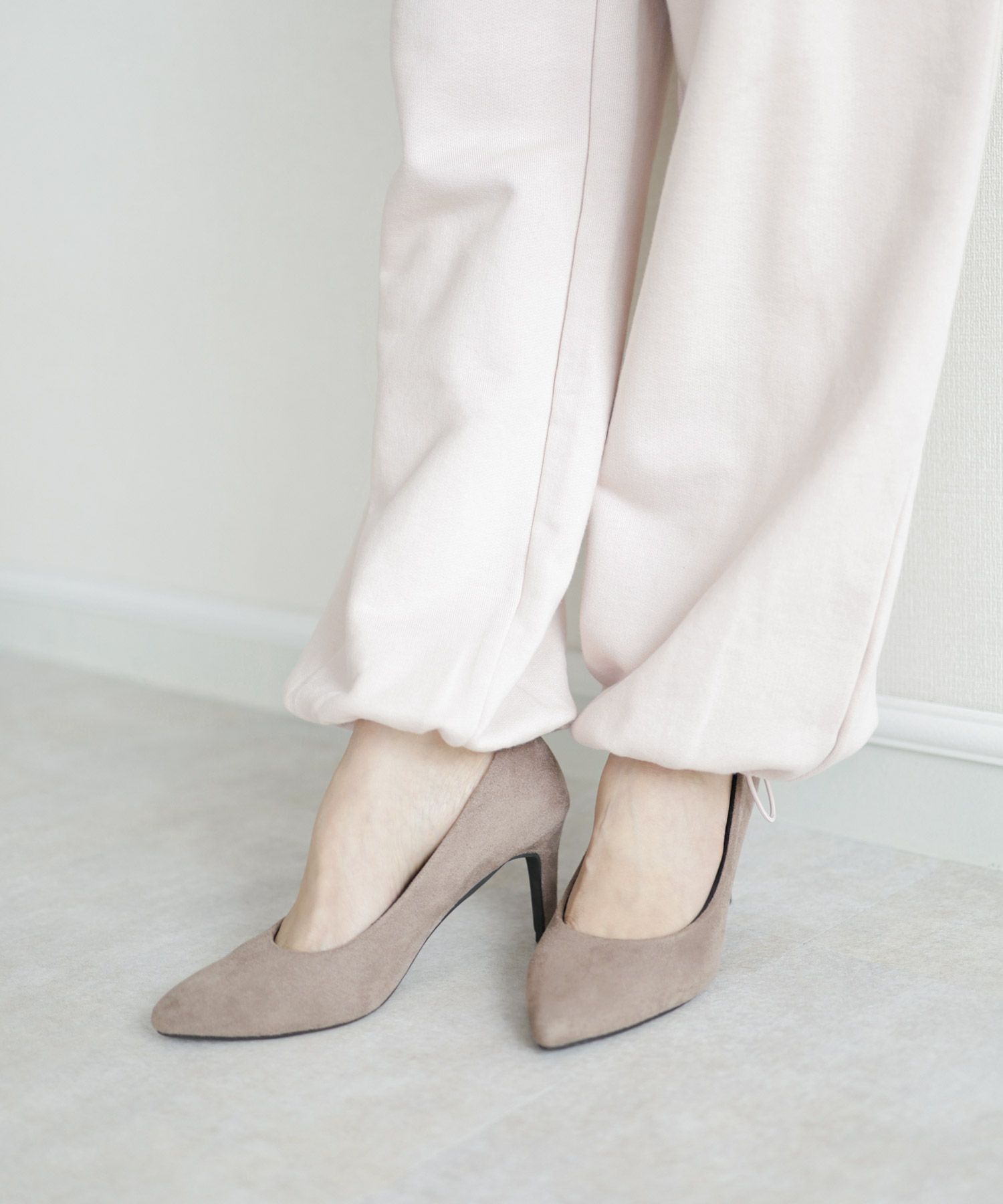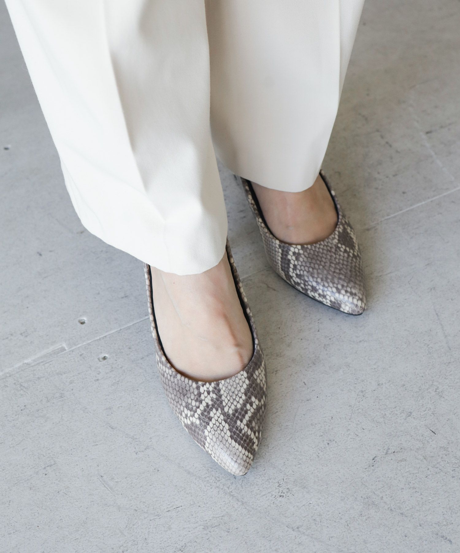 シャープなシルエットはそのままに先端部分から厚みをつけて中の体積をアップさせることによって窮屈感が軽減されたポインテッドトゥを実現しました。