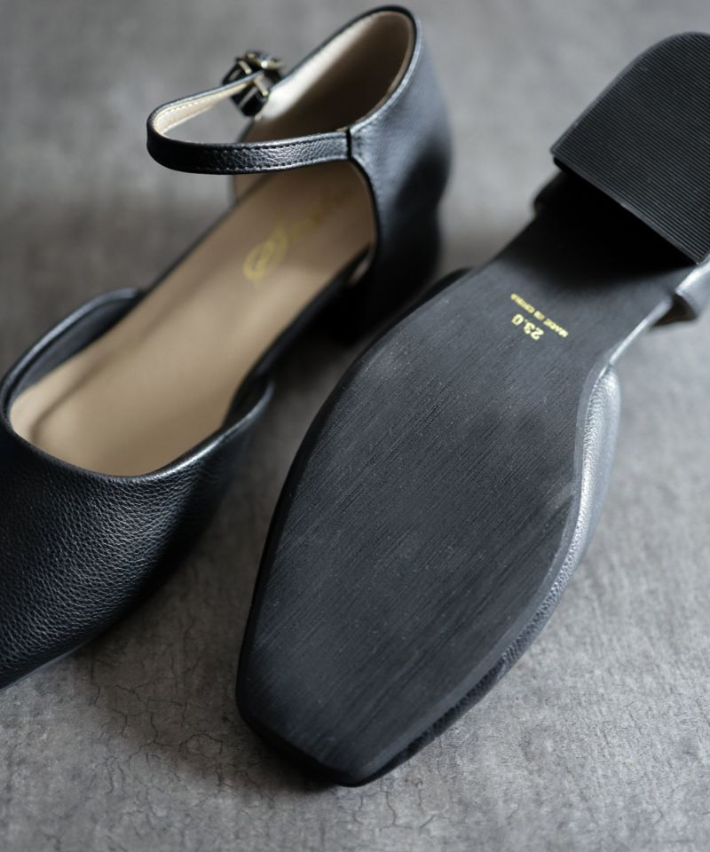 スクエアトゥアンクルストラップローヒールパンプス
