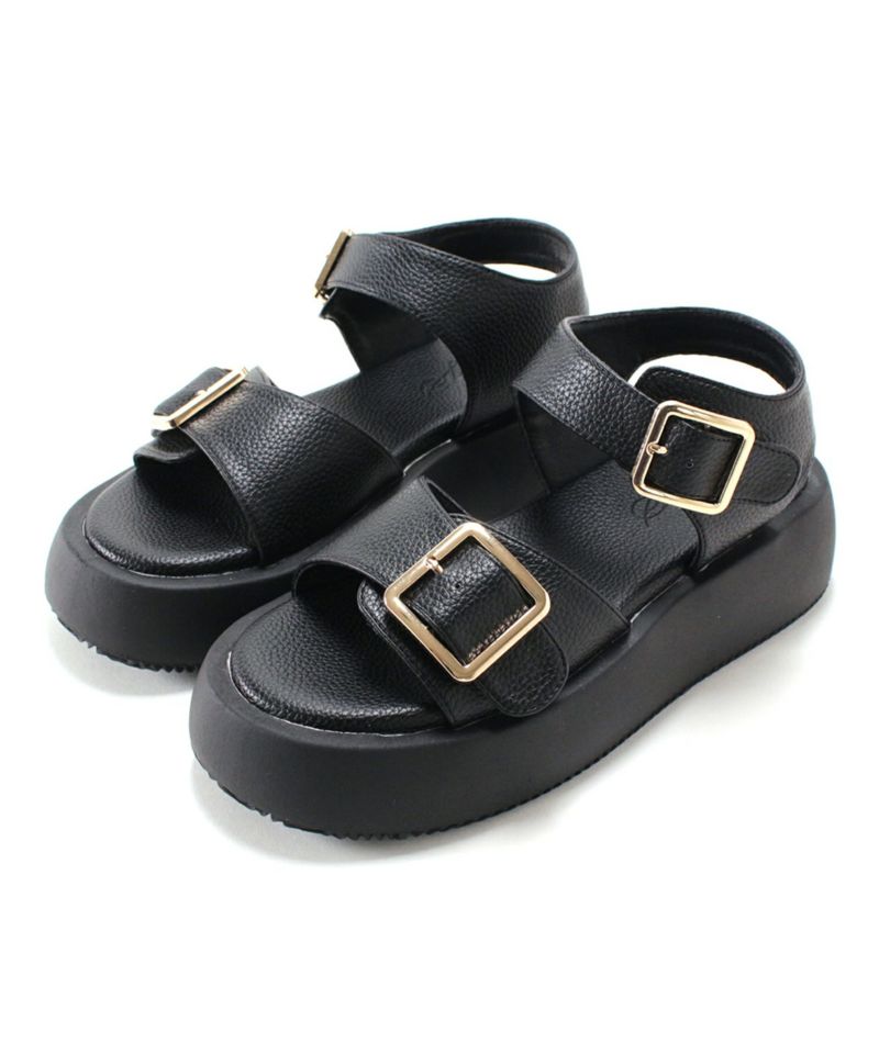 ワントーンのカラーリングに品のあるメタリックバックルが存在感を放つダブルベルトサンダル。