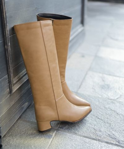 スクエアトゥのローヒールロングブーツ